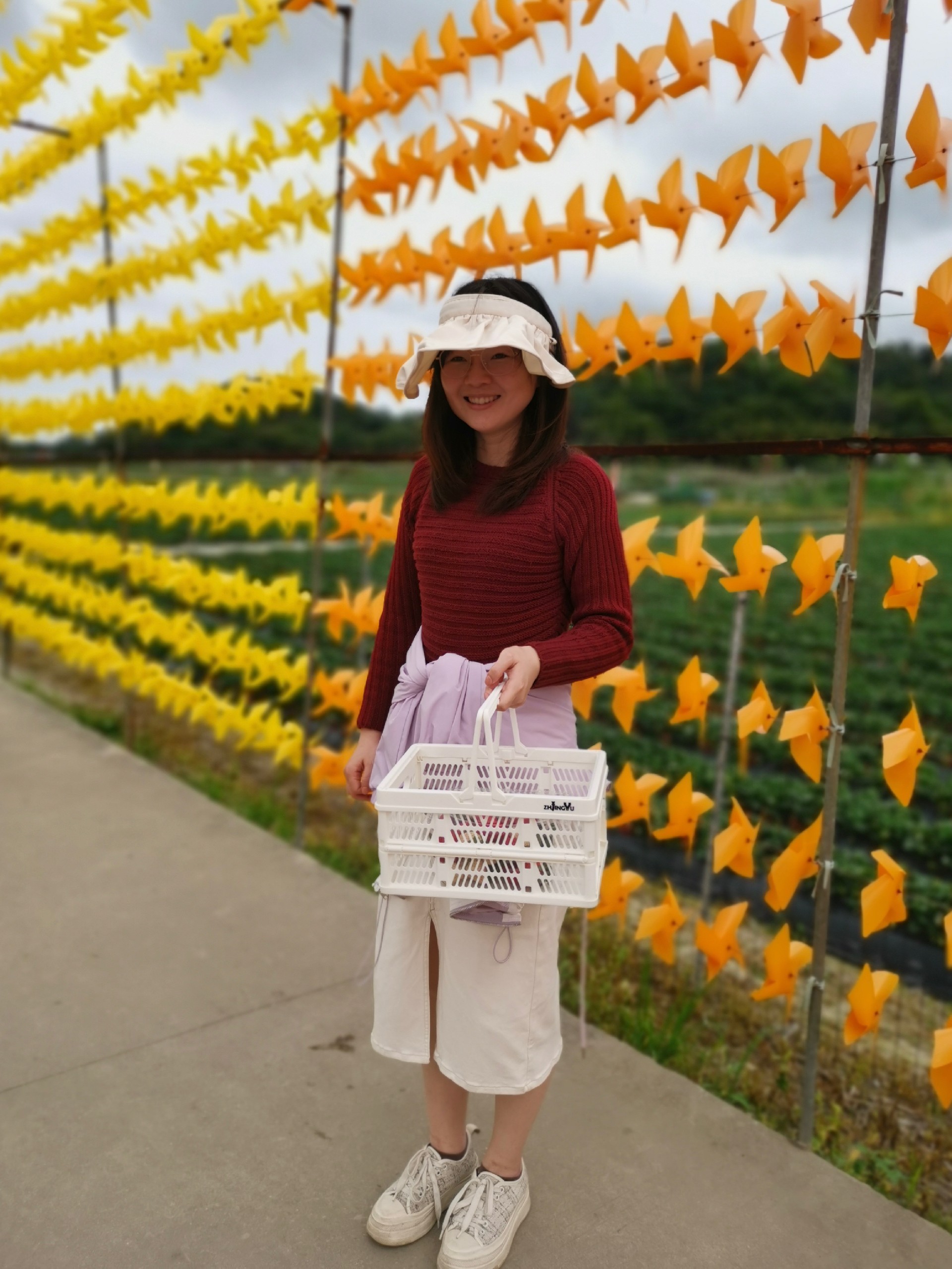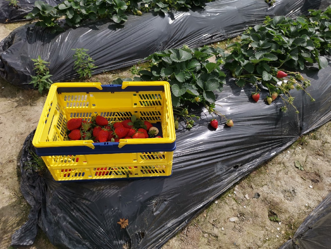 这个草莓园的草莓可真是又大又香又甜的,看我们满满的收获,这个蓝黄色折叠购物篮装上草莓也是颜值杠杠的哦