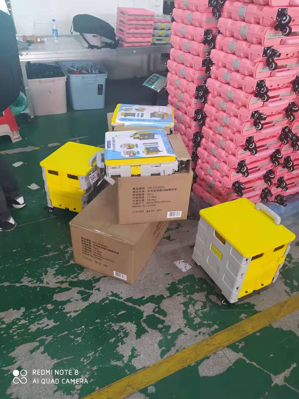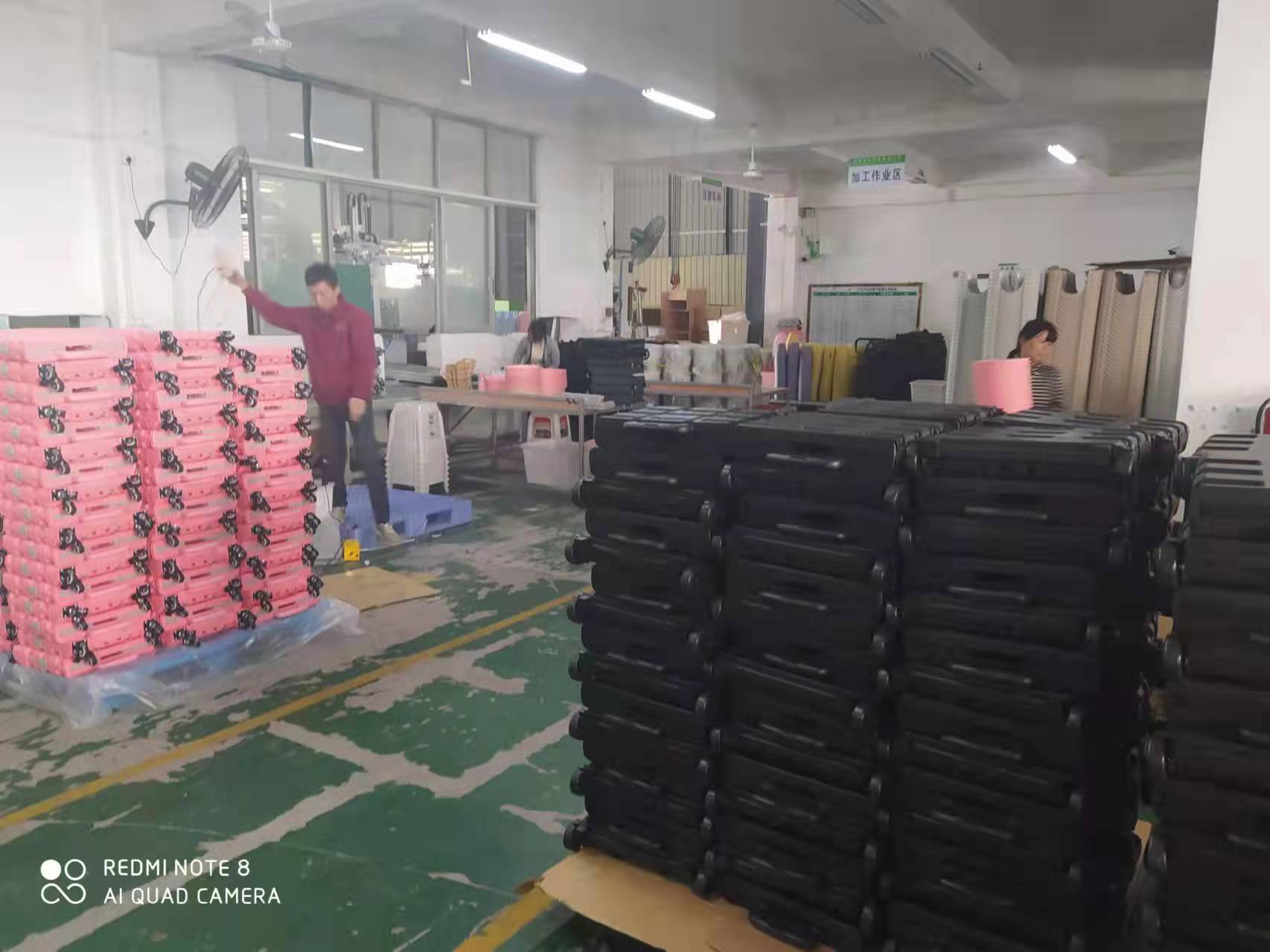 这是我们的生产车间,这里有粉灰色的折叠购物车,还有两轮黑色的买菜购物车